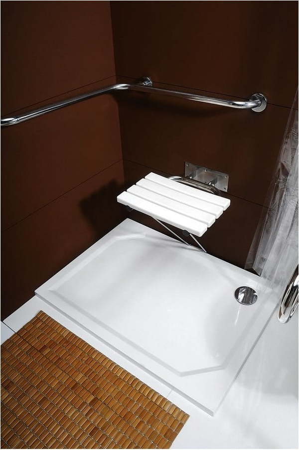 Toto sklopné sedátko s opěrnou nohou je navržené pro sprchový kout.