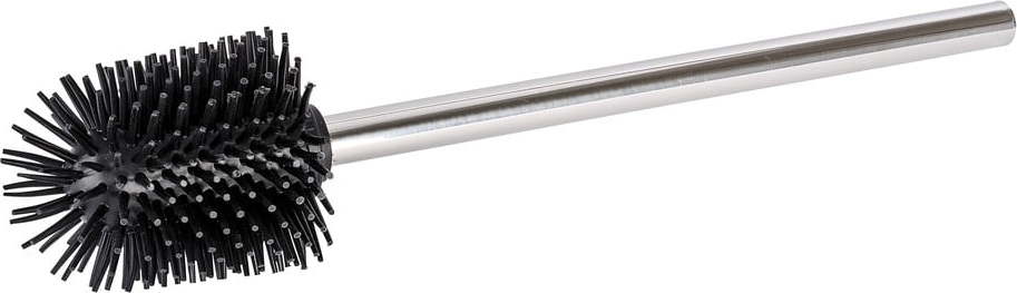 Toaletní kartáč značky Wenko je opatřen lesklou rukojetí z nerezové oceli a vyměnitelnou černou silikonovou hlavicí o průměru 8,5 cm.